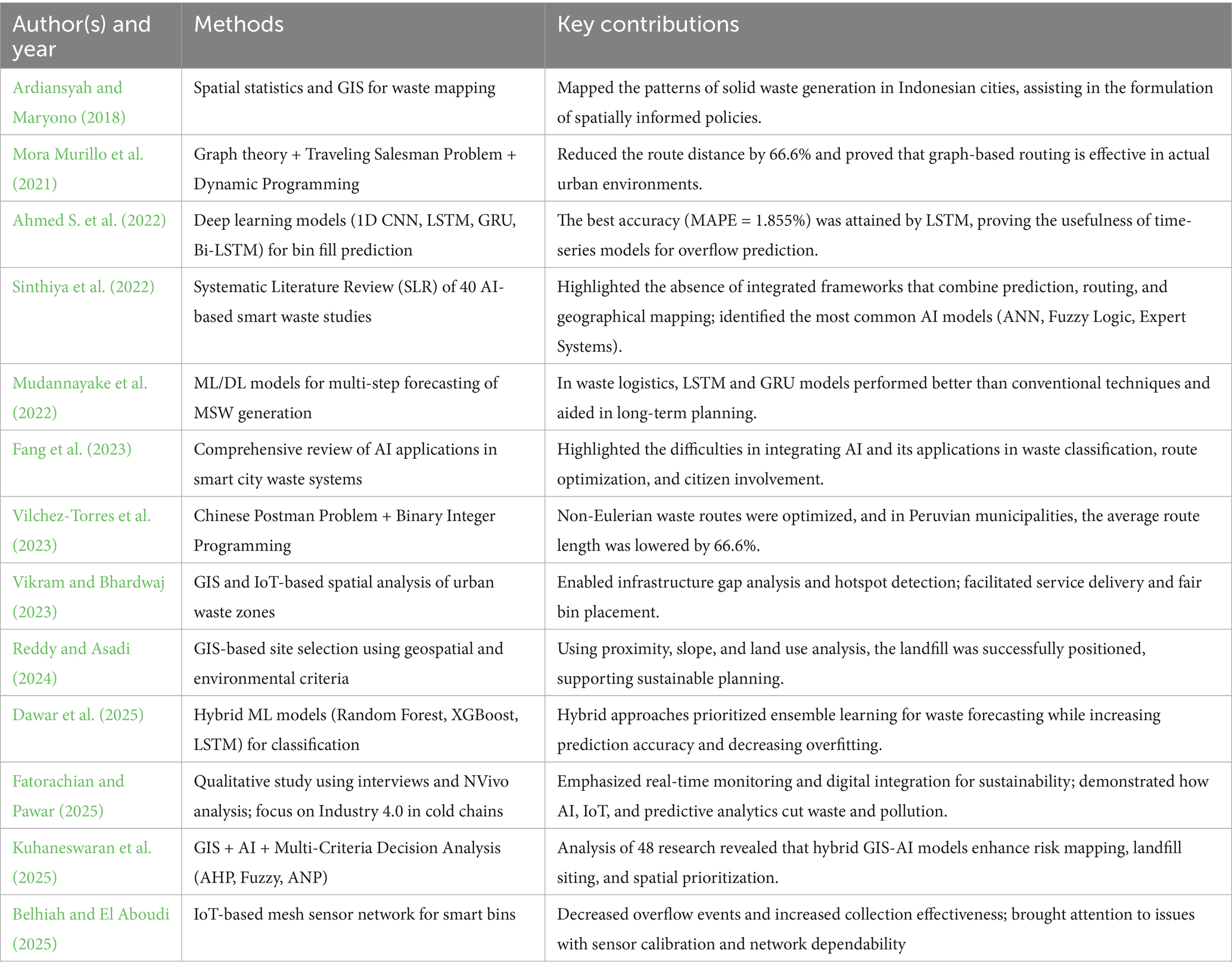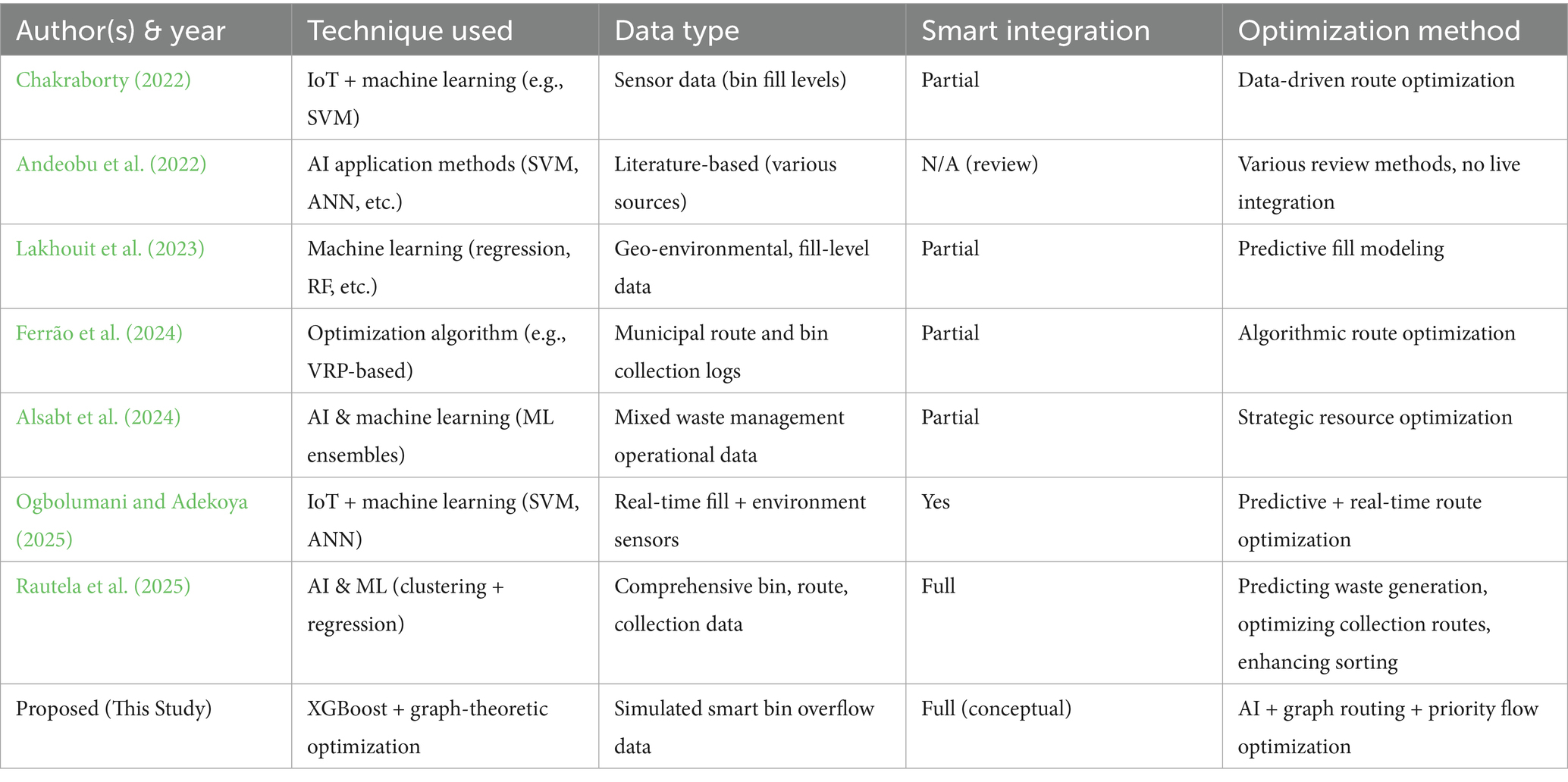 The studies included in Table 1 were chosen based on two main criteria: (i) methodological relevance, which included AI models for prediction, IoT-enabled sensing, graph-theoretic routing, and GIS-based spatial mapping; and (ii) representativeness, which highlighted recent and influential contributions from 2018 to 2025 that collectively illustrate the evolution of smart waste research. These studies were selected because they exhibit either unique techniques or common constraints (e.g., focussing solely on prediction, routing, or spatial mapping), highlighting the necessity for an integrated AI-IoT-graph framework.