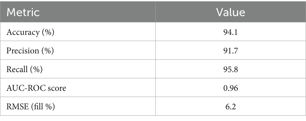 The XGBoost classifier showed a high degree of predictive power in predicting bin overflow incidents using fill-level data from the past. With an overall accuracy of 94.1%, precision of 91.7%, and recall of 95.8%, as shown in Table 2, the model demonstrated its efficacy in reducing false positives and false negatives. It is further confirmed that the model is robust in differentiating between bins that overflow and those that do not by the strong AUC-ROC score of 0.96. The model’s low margin of error, as indicated by its fill-level forecast RMSE of 6.2%, further qualifies it for real-time deployment in intelligent waste systems. These findings support the notion that XGBoost is a dependable engine for anticipatory waste monitoring in urban settings. These outcomes demonstrate that the AI model can accurately forecast bins that are prone to overflow within a 24-h period.