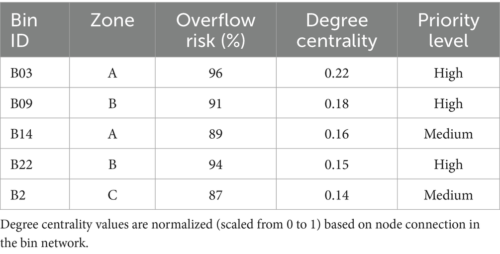 Inter-bin relationships were analyzed using a graph-based methodology. Edges indicate proximity or route dependency, whereas each node represents a bin. Metrics of centrality and clustering identified areas for strategic intervention.