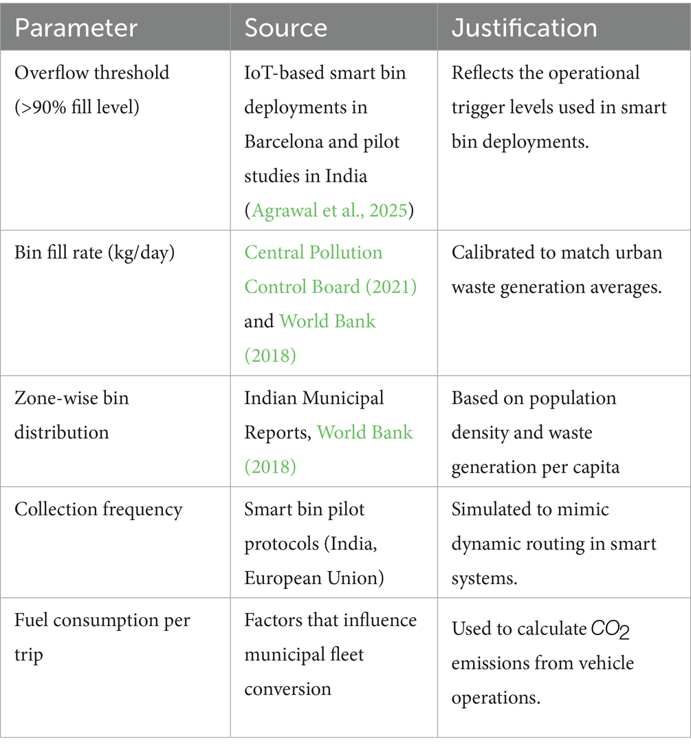The simulation monitors daily fill levels over a 7-day period, and the model forecasts overflow on day 8 based on historical data. Although simulated data were used, the design was evidence-based. Overflow criteria (>90% fill level) were derived from IoT-based smart bin experiments conducted in Barcelona and pilot implementations in Indian cities (Agrawal et al., 2025). Zone-level waste generation rates were benchmarked against urban averages reported by the World Bank (2018) and the Central Pollution Control Board (2021), confirming that the synthetic dataset accurately represents fill-level dynamics and operational constraints. These design choices enhance the credibility of the simulation and support the validity of the predictive analysis. Table 4 presents a summary of the benchmarking parameters and their sources.