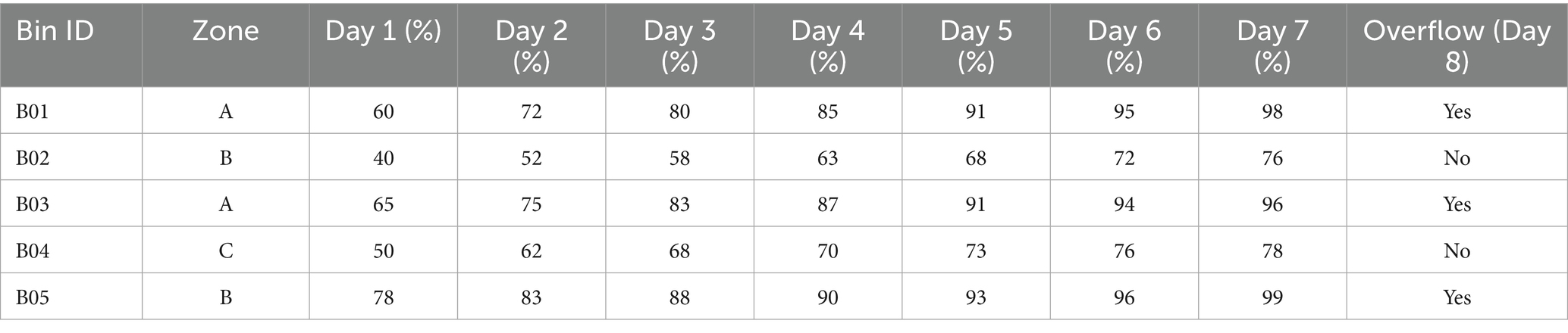 Using XGBoost classification, the model predicted the likelihood of bin overflow based on historical fill level patterns. In Table 5, an example of the simulated input data is presented.