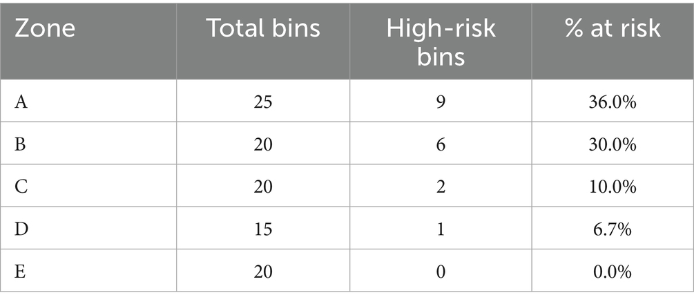 Figure 5. Overflow risk intensity across zones A–E. Darker shades indicate higher concentrations of high-risk bins.