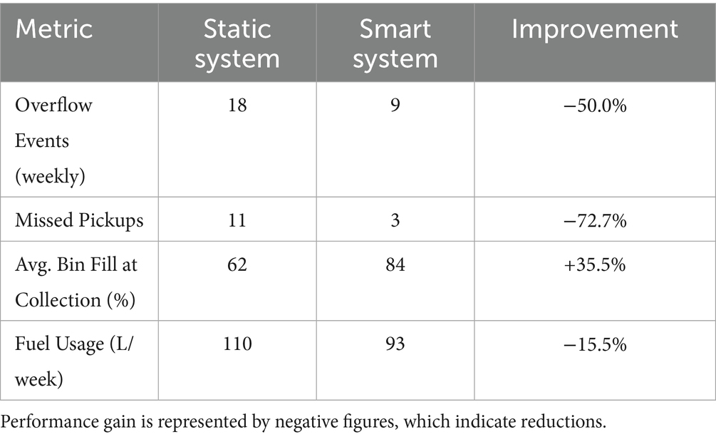Figure 7. Comparative performance metrics between AI-IoT-based smart waste system and traditional static scheduling.