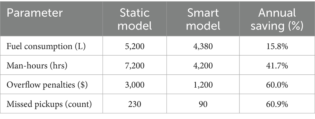 As illustrated in Figure 7, these performance metrics are derived from the simulation results of the proposed model. The results highlight the operational and environmental advantages of intelligent waste systems, including improved collection efficiency, reduced fuel consumption, and enhanced service reliability.