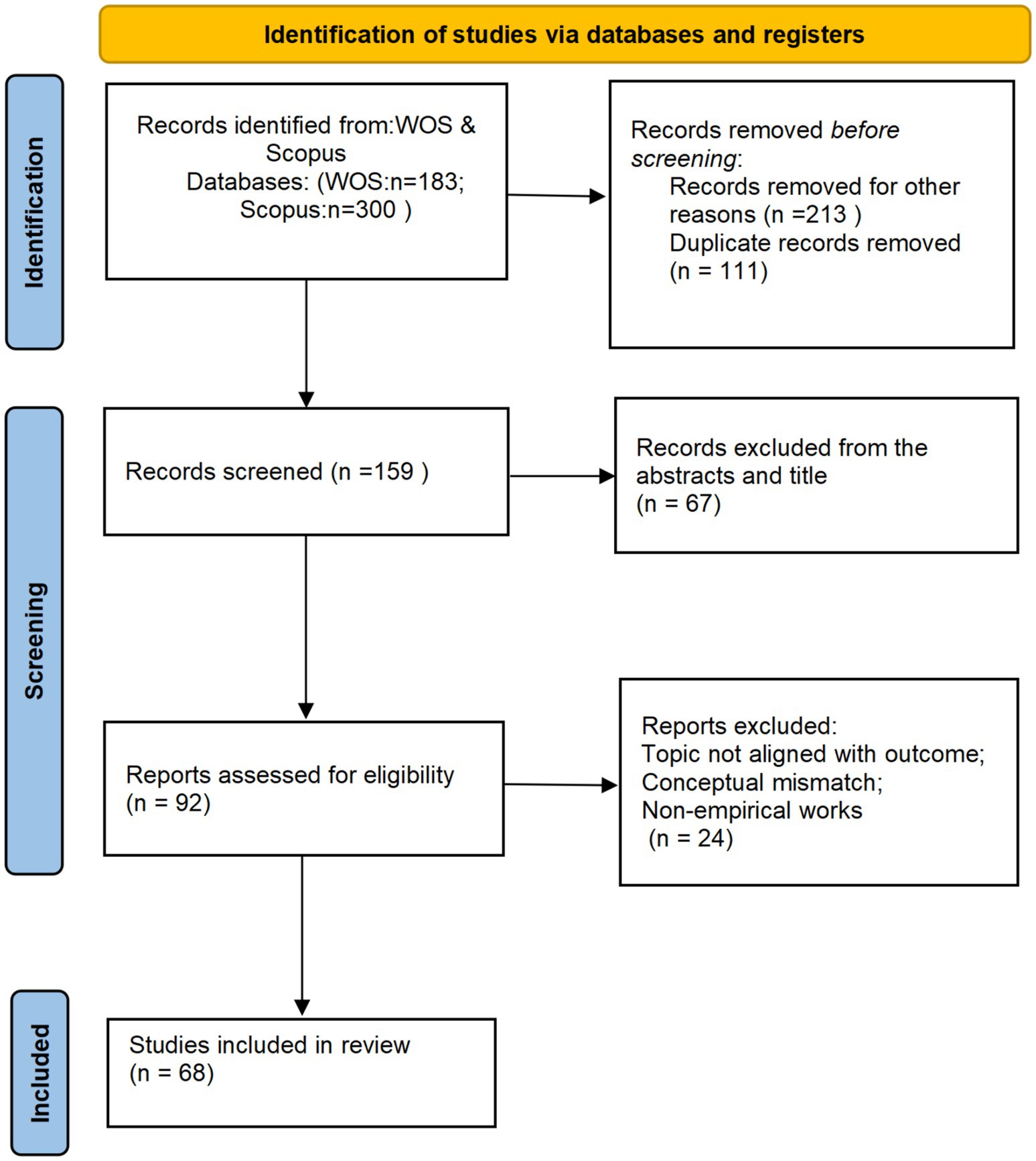 Two researchers independently applied these criteria to the titles and abstracts of the 159 articles. This process led to the exclusion of 67 studies. Any discrepancies in judgment between the researchers were resolved through discussion to achieve a consensus. The full texts of the remaining 92 articles were then retrieved and thoroughly assessed for final eligibility. In this final step, 24 articles were excluded as they did not fully meet the inclusion criteria upon detailed reading. This rigorous procedure resulted in a final sample of 68 articles deemed suitable for in-depth analysis.