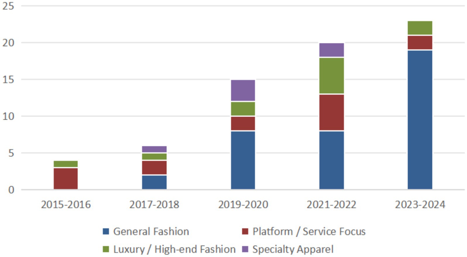 The analysis also reveals a shifting focus within the research domain. While early studies (2015–2018) were more evenly distributed between general fashion contexts and a focus on rental platforms, later research shows a pronounced emphasis on “General Fashion” contexts. This suggests a maturation of the field, moving beyond initial, platform-centric questions of ‘if’ and ‘how’ consumers rent, towards a more nuanced, holistic understanding of ‘why’ this behavior is integrated into their broader consumption lifestyles. Notably, research on “Luxury / High-end Fashion” rental has also gained steady traction, particularly from 2021 onwards, indicating a growing interest in this market segment.