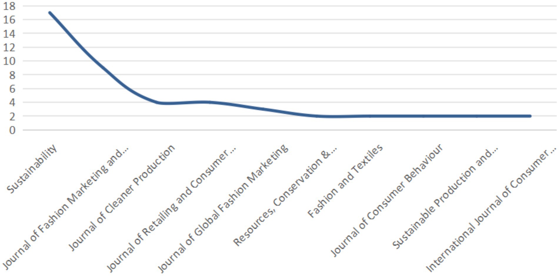Second, regarding the primary disciplinary outlets for this research, our analysis identifies a clear concentration in journals at the intersection of sustainability, business, and consumer studies. As shown in Figure 3, the journal Sustainability emerges as the leading outlet, having published 17 of the 68 articles in our sample. This underscores the central role of environmental concerns in driving the fashion rental research agenda. The Journal of Fashion Marketing and Management (n = 9), the Journal of Cleaner Production (n = 4), and the Journal of Retailing and Consumer Services (n = 4) are also significantly behind, but still notable. The prominence of these journals suggests that fashion rental research is primarily framed within the context of sustainable business management, fashion marketing, and consumer behavior studies.