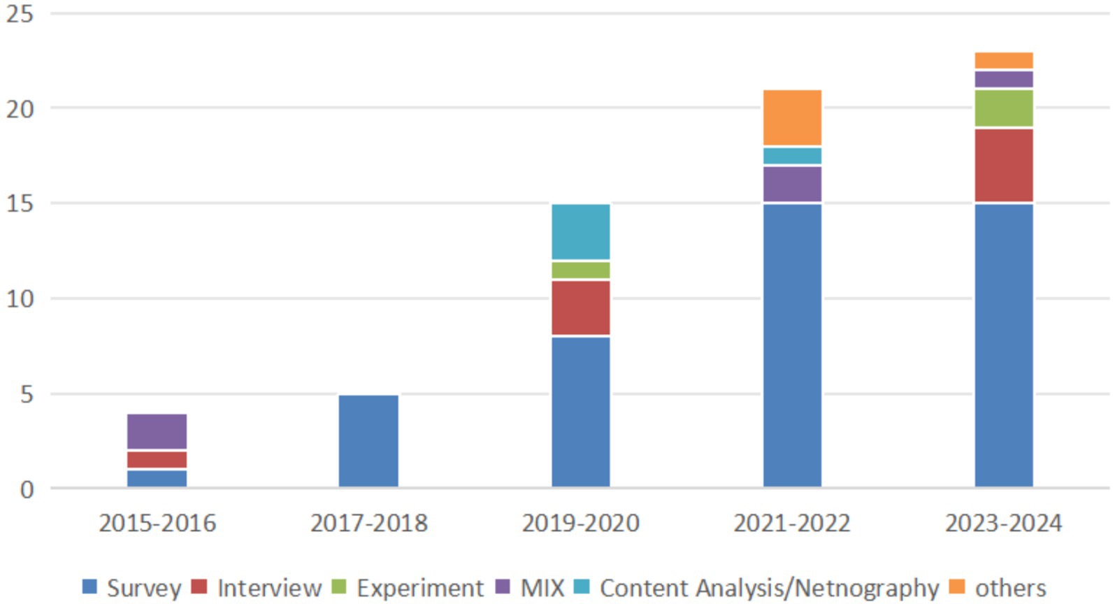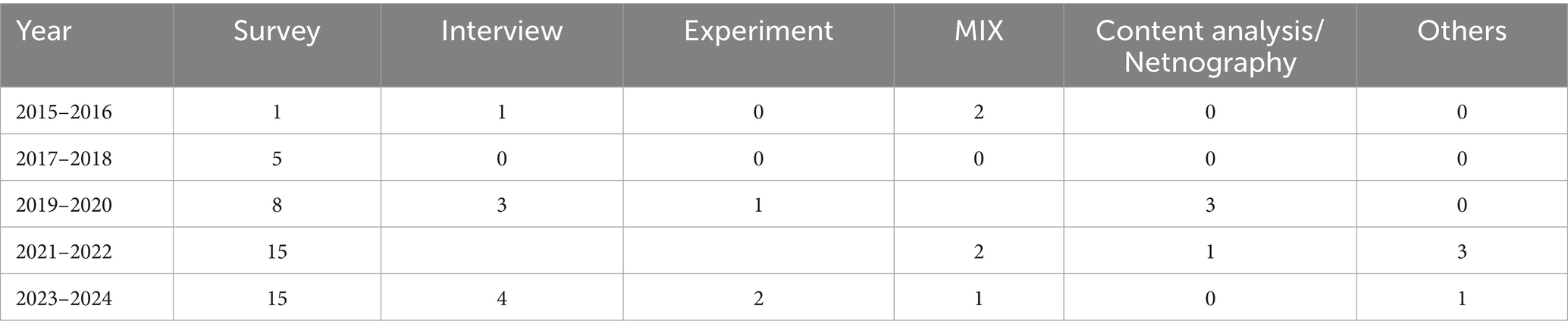 Table 2 and Figure 5 illustrate the research methods employed to study consumer behavior in the fashion rental industry over the past decade. The field has evolved, with specific research approaches gaining popularity at different times. Surveys have been the most common method for understanding consumer opinions and intentions. Qualitative research, like interviews, has also been used to gain in-depth insights. Experimental research, which tests cause-and-effect relationships, is becoming increasingly common. Some studies employ a combination of methods to obtain a more comprehensive picture. This gradual diversification suggests the field is maturing, though surveys remain the dominant approach. The vast majority of survey-based studies employ cross-sectional designs rather than longitudinal approaches.