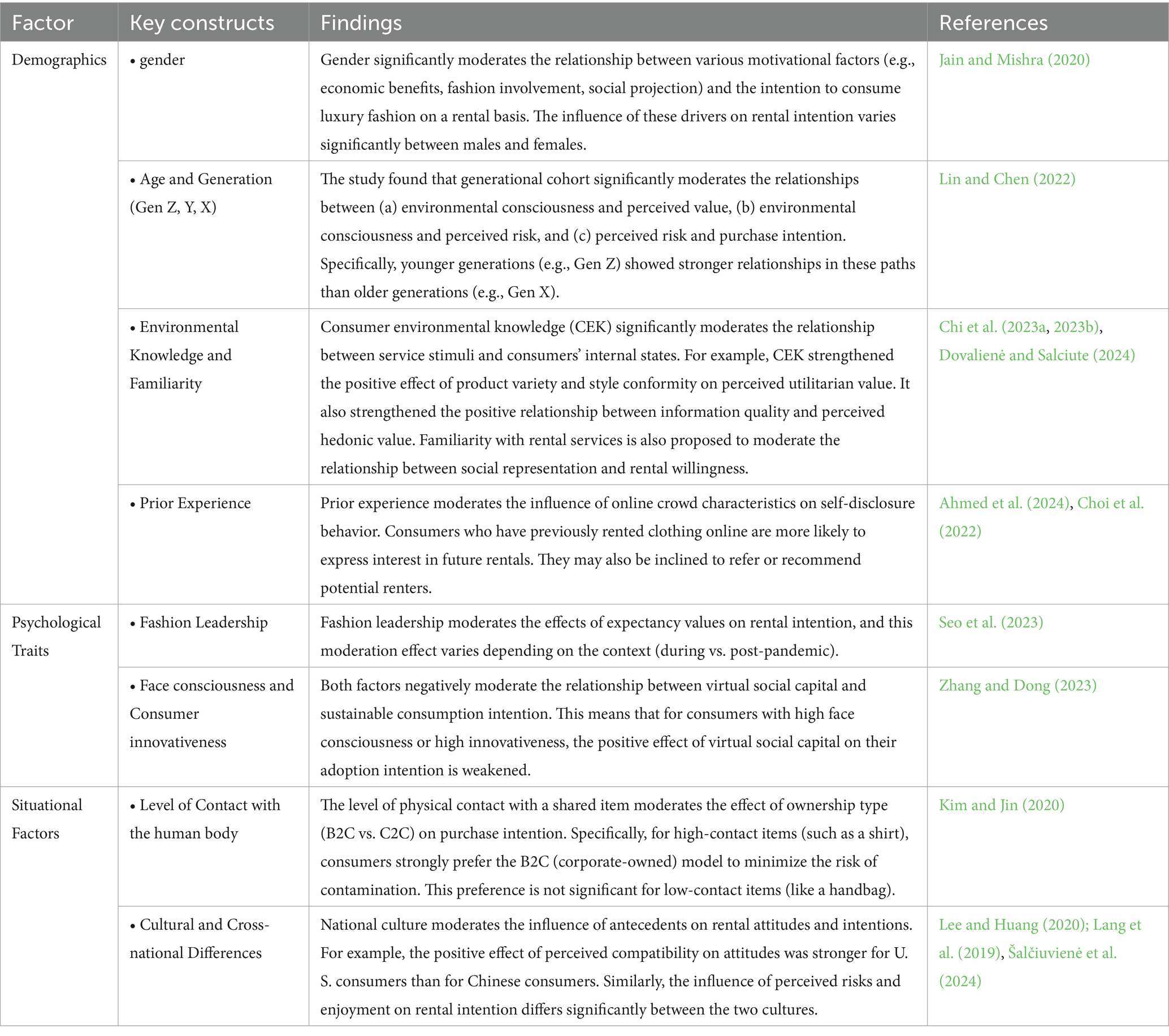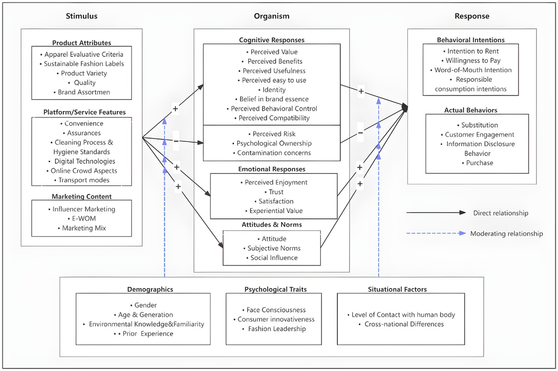 Third, our framework highlights the importance of moderators, adding theoretical nuance. We demonstrate that the relationships between stimuli, organism, and response are not universal across all contexts. For example, our review reveals that cultural context significantly moderates consumer responses (Lang et al., 2019; Lee and Huang, 2020a; Lee and Huang, 2020b), and psychological traits, such as fashion leadership, influence the impact of marketing stimuli (Seo et al., 2023). This provides a theoretical basis for moving from universal models to more context-sensitive, contingent theories of fashion rental adoption.