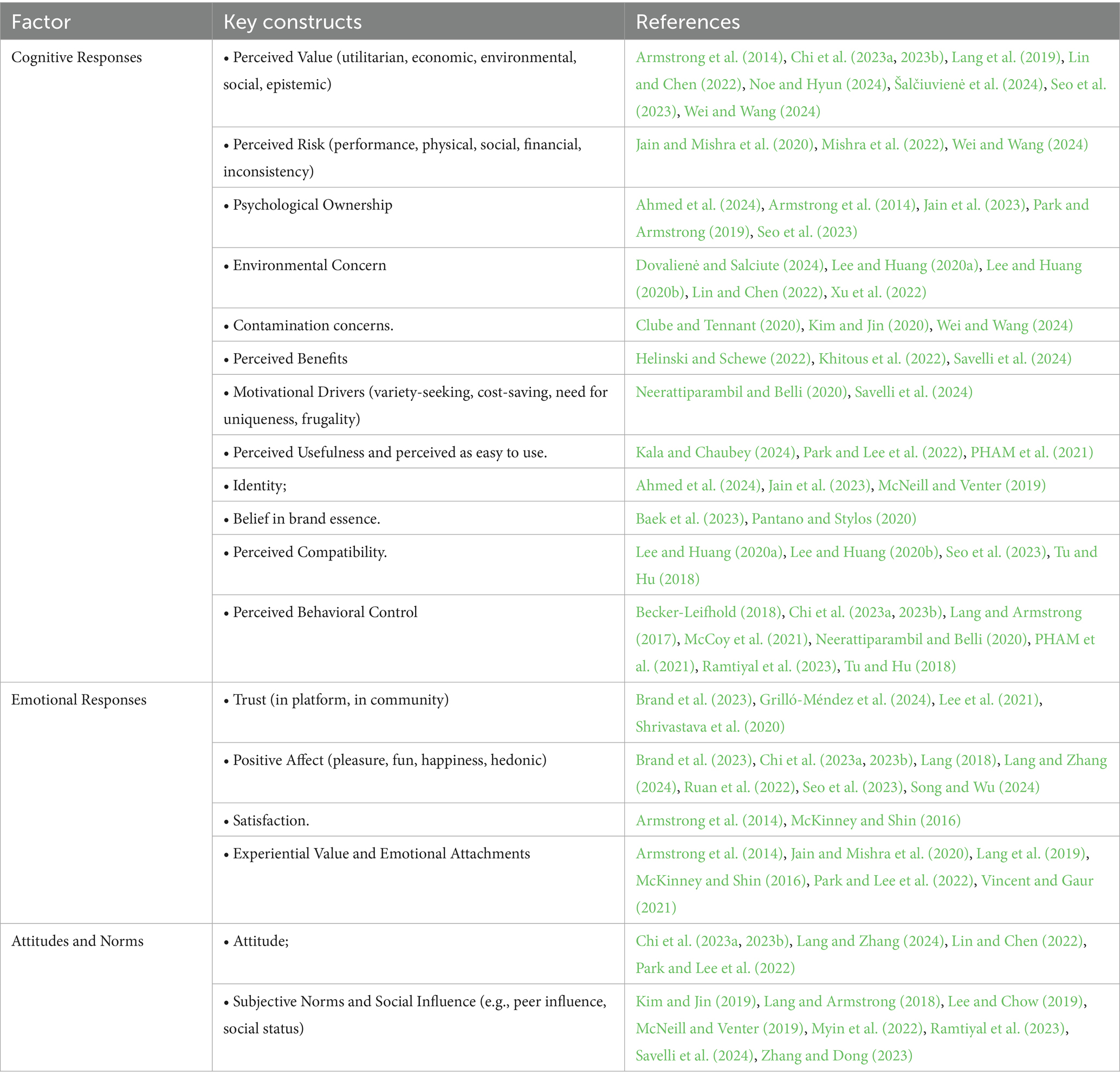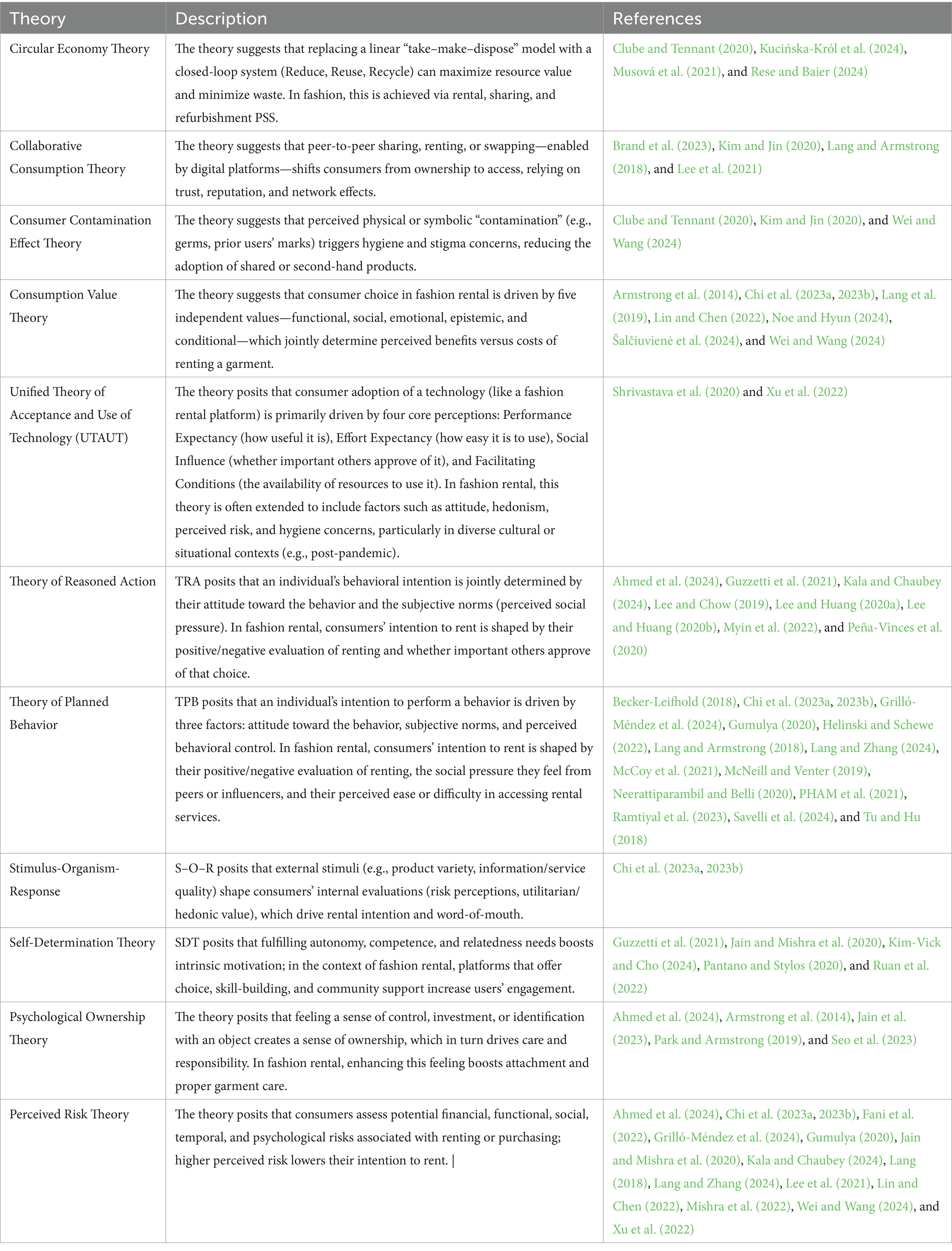 Table 1 summarizes the theoretical frameworks employed in the existing literature to explain fashion rental consumer behavior. Our analysis identifies a clear hierarchy and several thematic clusters among the theories used. At the forefront are intention-based behavioral models, with the Theory of Planned Behavior (TPB) (Becker-Leifhold, 2018; Chi et al., 2023a, 2023b; Grilló-Méndez et al., 2024; Gumulya, 2020; Helinski and Schewe, 2022; Lang, 2018; Lang et al., 2019; Lang and Armstrong, 2017; Lang and Zhang, 2024; McCoy et al., 2021; McNeill and Venter, 2019; Neerattiparambil and Belli, 2020; PHAM et al., 2021; Ramtiyal et al., 2023; Savelli et al., 2024; Tu and Hu, 2018) and its predecessor, Theory of Reasoned Action (TRA) (Ahmed et al., 2024; Guzzetti et al., 2021; Kala and Chaubey, 2024; Lee and Chow, 2019; Lee and Huang, 2020a; Lee and Huang, 2020b; Mishra et al., 2020, 2022; Myin et al., 2022; Peña-Vinces et al., 2020), being the most frequently applied frameworks, highlighting the field’s strong focus on rational, cognitive antecedents like attitudes and subjective norms. This is complemented by a second prominent cluster of theories centered on value and technology adoption, where the Consumption Value Theory (Armstrong et al., 2014; Chi et al., 2023a, 2023b; Lin and Chen, 2022; Noe and Hyun, 2024; Seo et al., 2023; Wei and Wang, 2024) is used to unpack the multi-faceted benefits of renting, and the Use of Technology (UTAUT)(Shrivastava et al., 2020; Xu et al., 2022) is applied to frame rental platforms as a technology. A third group of theories delves into the unique psychological and contextual factors of access-based consumption; these include frameworks exploring barriers, such as the Perceived Risk Theory (Ahmed et al., 2024; Chi et al., 2023a, 2023b; Fani et al., 2022; Grilló-Méndez et al., 2024; Gumulya, 2020; Jain and Mishra, 2020; Kala and Chaubey, 2024; Lang, 2018; Lang et al., 2019; Lang and Zhang, 2024; Lee et al., 2021; Lin and Chen, 2022; Mishra et al., 2020; Wei and Wang, 2024; Xu et al., 2022) and the Consumer Contamination Effect Theory (Clube and Tennant, 2020; Kim and Jin, 2019; Wei and Wang, 2024), as well as those investigating nuanced drivers like Psychological Ownership Theory (Ahmed et al., 2024; Park and Armstrong, 2019; Seo et al., 2023) and Self-Determination Theory Self-Determination Theory (Jain and Mishra, 2020; Kim-Vick and Cho, 2024; Mishra et al., 2020; Pantano and Stylos, 2020; Ruan et al., 2022). The entire research stream is often situated within the broader paradigms of the Circular Economy Theory (Kucińska-Król et al., 2024; Musová et al., 2021; Papamichael et al., 2024; Rese and Baier, 2024) and Collaborative Consumption (Brand et al., 2023; Kim and Jin, 2019; Lang and Armstrong, 2017; Lee et al., 2021), which provide the overarching conceptual context. While only one study in our sample explicitly used the Stimulus-Organism-Response framework (Chi et al., 2023a, 2023b), its underlying logic—that external cues are associated with internal states which relate to behavioral outcomes—is implicitly present in many studies. This observation supports our choice to use S–O–R as an overarching structure to synthesize the fragmented findings.
