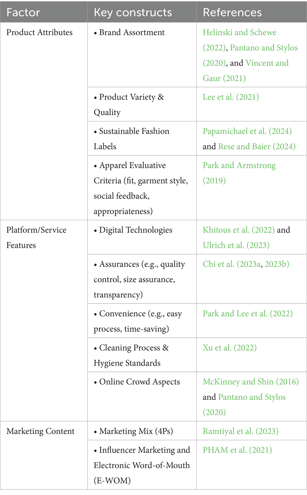 The stimuli in the context of fashion rental are the various external cues provided by the rental service or the surrounding market environment that initiate the consumer’s evaluation process. Our analysis of the literature, summarized in Table 3, identifies three primary categories of stimuli: product attributes, platform/service features, and marketing content.