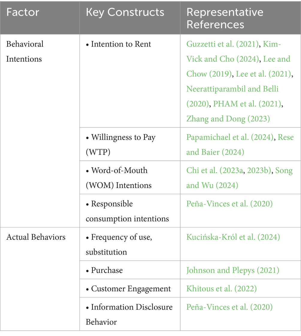 Attitudes and norms, which are significantly shaped by the Theory of Planned Behavior, represent an advanced level of evaluation. A consumer’s attitude toward renting reflects their comprehensive evaluation of rental behavior, influenced by cognitive and emotional responses (McCoy et al., 2021). Subjective norms and social influence, reflecting perceived social pressures from peers, family, or influencers, consistently shape rental intentions, particularly in collectivistic societies (Lee and Huang, 2020a; Lee and Huang, 2020b). The response is the ultimate and observable result of a consumer’s interaction with stimuli and their subsequent internal evaluations.