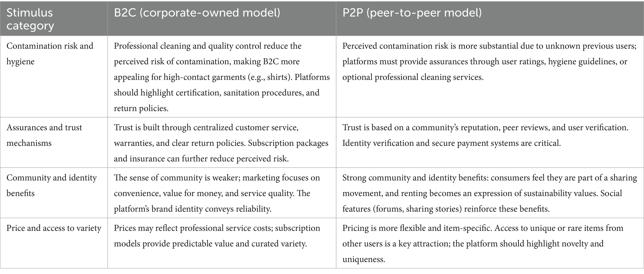 While the integrative S–O–R framework captures the general adoption process, our review also indicates that the same stimuli can have markedly different effects depending on the operational model used. Business-to-consumer (B2C) platforms manage inventory centrally and thus offer professional assurances and standardized services, whereas peer-to-peer (P2P) platforms facilitate exchanges between individuals and rely more on community dynamics. Table 7 summarizes how key stimuli operate differently across these models. Understanding these nuances helps to tailor strategies to the appropriate context.