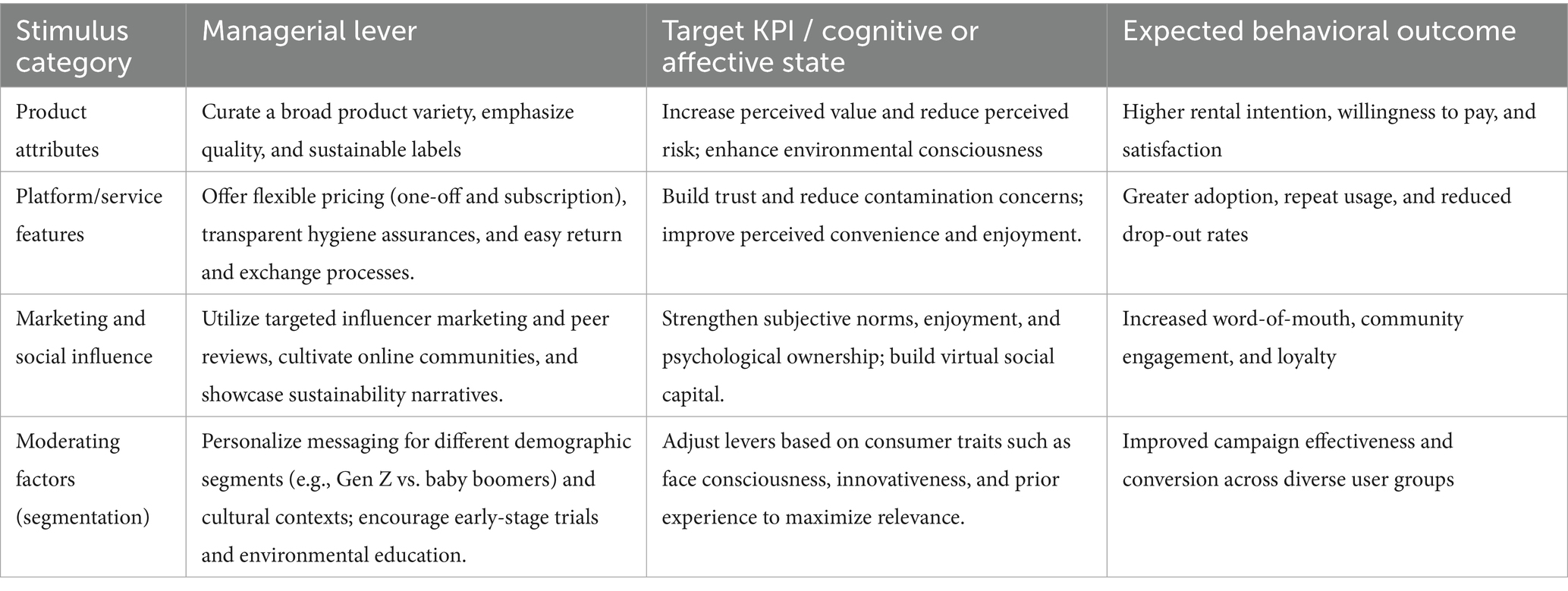 To translate the integrative S–O–R framework into actionable guidance, Table 8 provides a checklist that maps stimuli to concrete managerial levers, the key performance indicators (KPIs) they influence, and the expected effects on consumer psychology and behavior. This mapping clarifies how managers can design interventions that target specific cognitive or emotional responses, thereby driving the adoption of rental services.