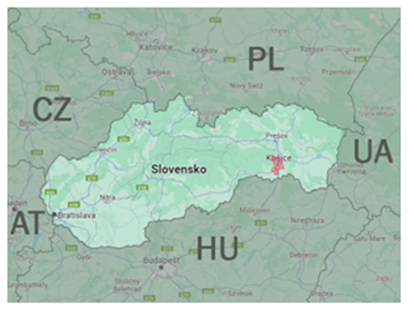 Figure 1. Location of the pilot green façade in Košice, eastern Slovakia, within the Central European continental climate zone.