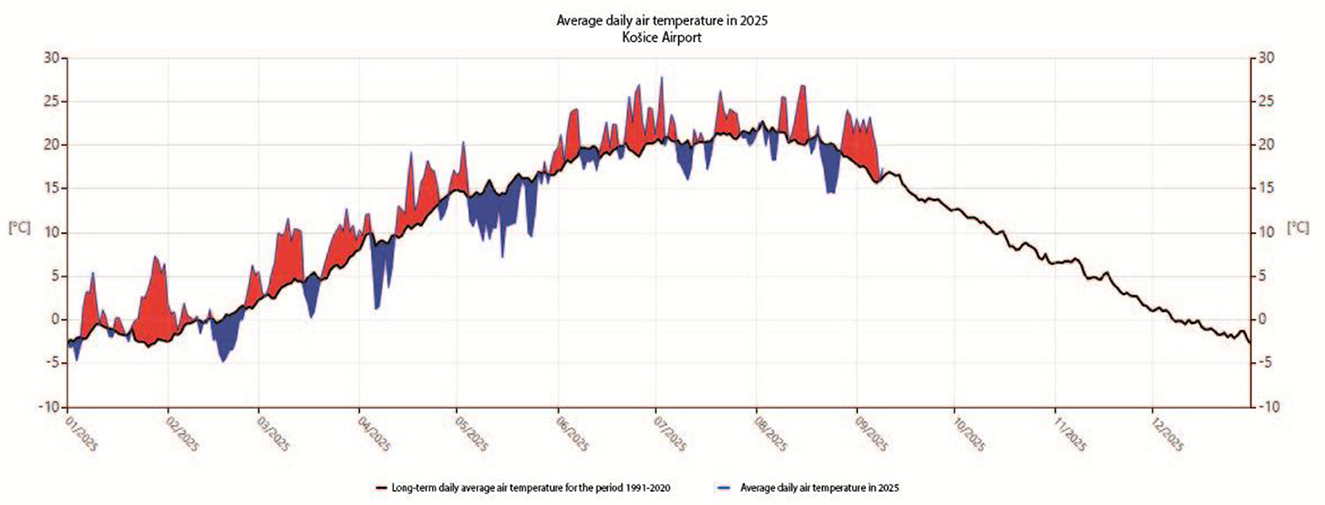 Figure 2. Average daily air temperature in Košice from November 2024 to August 2025 (data from Slovak Hydrometeorological Institute).