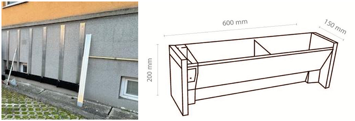 Based on the systems reviewed above, we selected a simple gravity-driven irrigation system. Considering the relatively small façade size, it would be inefficient to install a recirculating system, which is more technically demanding and costly to maintain. Moreover, since the use of modular plant boxes ensures a sufficient substrate volume, a drip irrigation setup was not required.