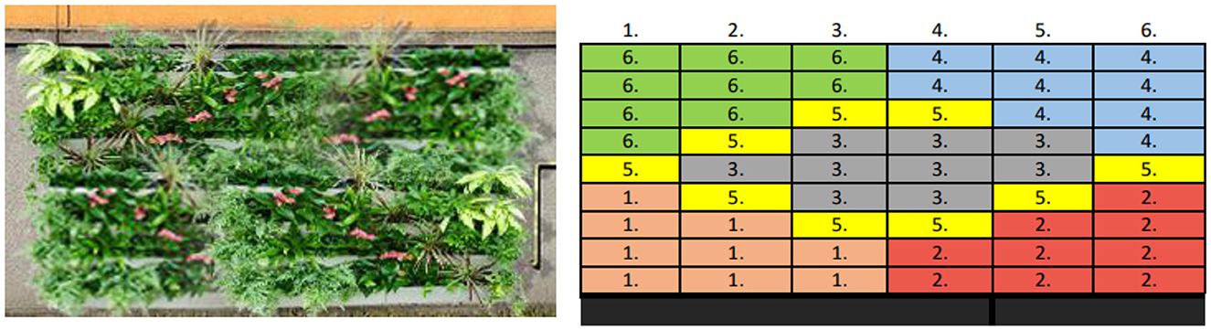 The façade structure consisted of an aluminum subframe with modular containers (30 × 20 × 20 cm). This system was selected for its flexibility and suitability for local climatic conditions. In October 2024, 180 plants (six species, 30 individuals each) were established (Figure 3). Plant selection was based on resilience, shade tolerance, and ornamental value, following previous recommendations for vertical greenery (Perini and Rosasco, 2016; Salisbury et al., 2023).