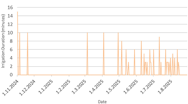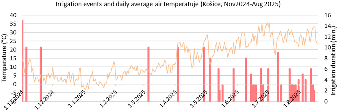 Irrigation demand closely followed air temperature rather than rainfall. Events were rare and short during the winter months, increased in frequency and duration in late spring, and then decreased again during an unusually cool July (Figure 3). In total, 34 irrigation events were recorded between October 2024 and August 2025, with an average duration of 4.7 min and a cumulative time of about 160 min.