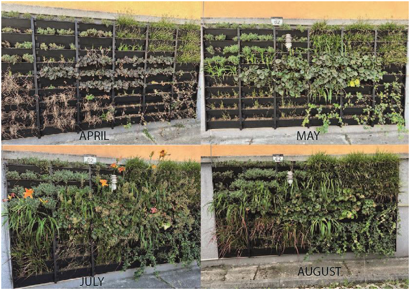 6. Hosta sieboldiana (Hook.) Engl. ‘Frances Williams'/Hebe spp.: Hosta seedlings arrived in poor condition and were replaced by Hebe within the first month. Hebe spp. is a hardy evergreen shrub tolerant of sun and suitable for façade placement in lower modules exposed to higher irrigation.