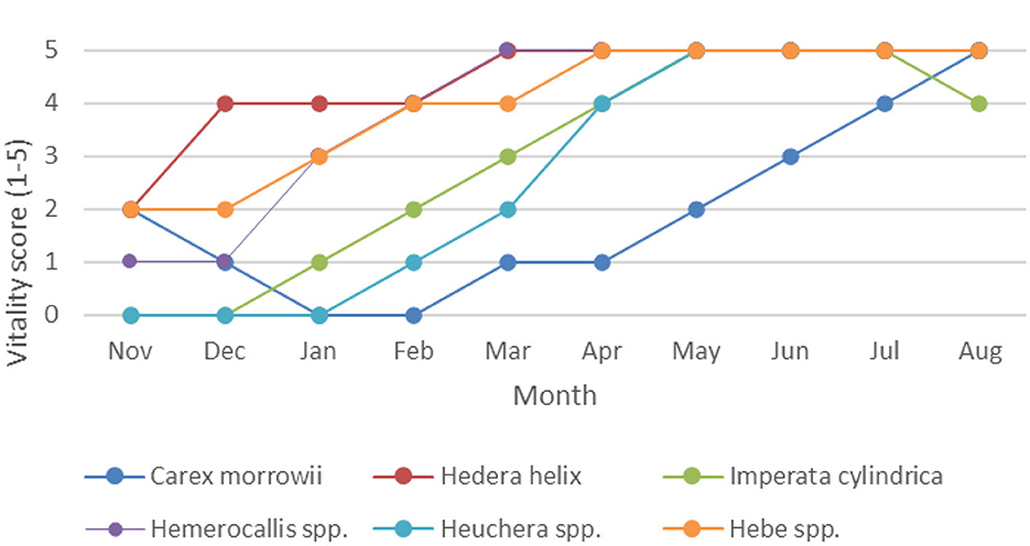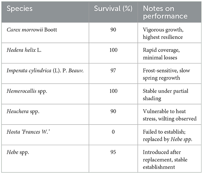 Hemerocallis spp. L. also performed well with 100% survival, maintaining stability despite partial shading. Imperata cylindrica (L.)P. Beauv showed higher sensitivity to frost and slow spring regrowth, resulting in 97% survival. In contrast, Heuchera spp. L. was the most vulnerable, with only 90% survival, and frequent signs of decline during hotter periods. Hosta spp.seedlings failed to establish and were completely lost by early summer. They were subsequently replaced by Hebe spp. which adapted moderately well during the remaining months, though long-term performance could not be fully evaluated within the first year. These findings underline the importance of careful species selection, highlighting the resilience of grasses and evergreen climbers compared to more sensitive perennials.