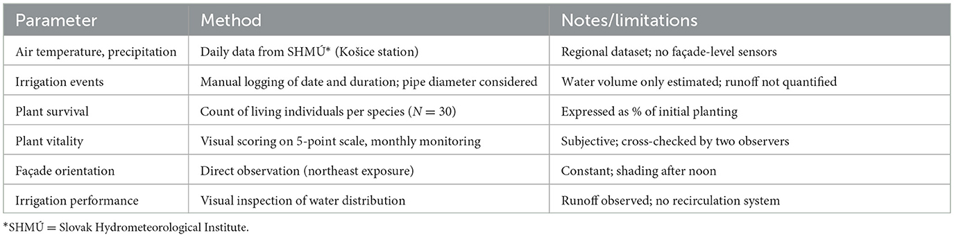 Such integrated strategies align with the emerging paradigm of resilient, water-conscious campus design and offer a meaningful context for the façade's practical relevance and future scalability. The study focuses on three objectives: (i) to analyse irrigation demand in relation to local climate, (ii) to assess plant survival and vitality during the first year of operation, and (iii) to identify species most resilient to continental conditions. Rather than providing universal guidelines, the study offers locally grounded evidence that can inform applications of vertical greenery in similar climates. By documenting practical challenges and opportunities, the findings contribute to the broader knowledge base supporting the European Green Deal (European Commission, 2020) and the UN Sustainable Development Goals (SDG 11: Sustainable Cities and Communities; SDG 13: Climate Action; SDG 15: Life on Land).