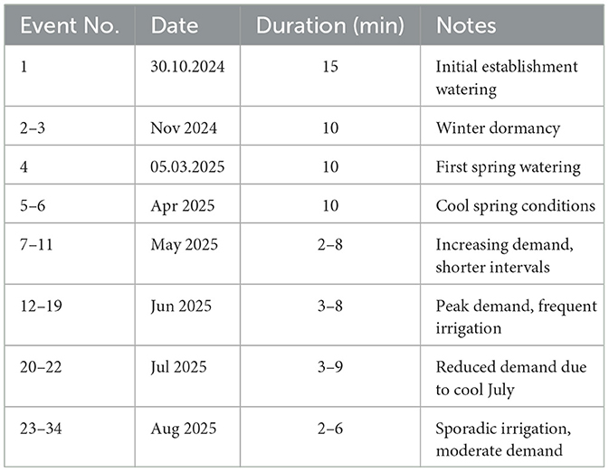 All irrigation events were logged, including date, duration, and basic hydraulic parameters. An overview of recorded irrigation events is presented in Table 2.