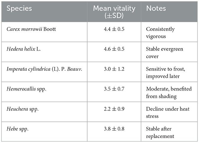 Imperata cylindrica (L). P. Beauv. (mean 2.8 ± 1.32) showed slow regrowth in spring but stabilized later in the season. Hemerocallis spp. (mean 3.2 ± 0.92) maintained stable growth under partial shading. By contrast, Heuchera spp. (mean 1.8 ± 0.92) was the most vulnerable, with frequent signs of wilting and necrosis during hotter days. Hosta spp. seedlings failed to establish and were replaced by Hebe spp., which achieved moderate vitality (mean 2.7 ± 1.25) during the remaining season. The mean vitality scores for each species across the monitoring period are presented in Figure 8.