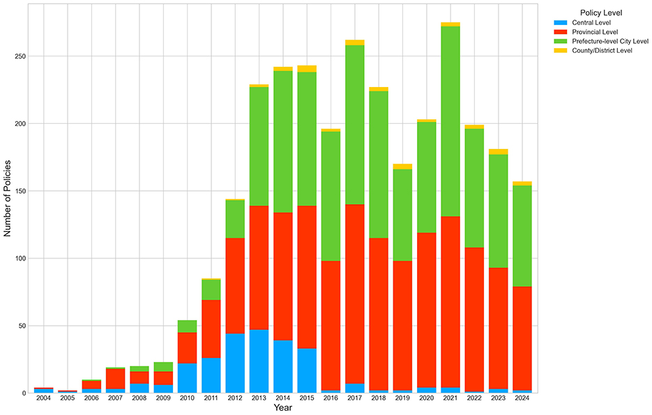 However, the existing literature reveals significant limitations in providing an analytical framework that is comprehensive, dynamic, and possesses strong explanatory power. First, the aforementioned research largely consists of static, “snapshot” analyses, lacking a systematic quantitative investigation into how the core agenda (thematic) priorities of the policy system have dynamically shifted over a two-decade timeline (Segal and Baumgartner, 2024). Policy agendas are not static; questions concerning which themes are persistent core issues, which are emerging or declining peripheral topics, and the underlying logic driving these changes, remain to be answered (Ye et al., 2024). Second, there is an insufficient understanding of the complex interactions within the policy instrument mix. Existing analyses tend to treat different instruments in isolation, thereby failing to illuminate how various tools (e.g., regulatory, incentive-based, informational) are combined in practice, how this portfolio mix changes over time and across governance levels, and what their underlying synergistic or conflicting relationships are (Tian et al., 2024). Finally, the policy implementation process within the MLG structure is inadequately explained. How are central policy intentions transmitted, interpreted, and adaptively executed within the vast local bureaucratic system? What accounts for the significant regional disparities (east, central, and west) in policy responses and their underlying drivers? These questions regarding the process of policy implementation and variation within a MLG context require deeper investigation (Liu and Zhang, 2024).