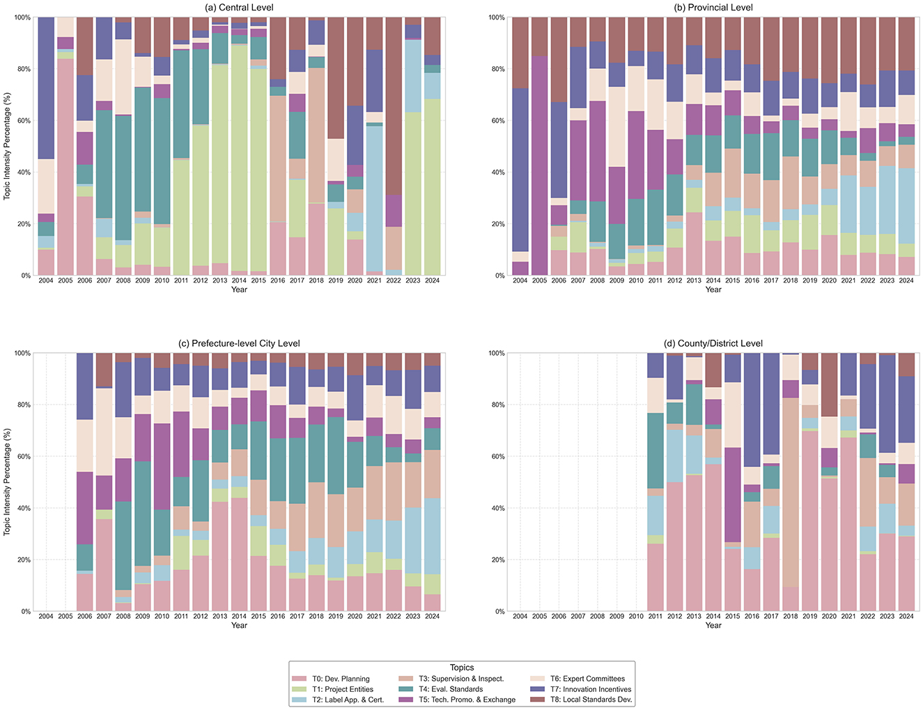 To conduct an in-depth investigation of the operational characteristics of China's green building policy within its MLG system (RQ3), this study undertakes a diachronic comparative analysis of the policy agendas across four governmental levels: central, provincial, municipal, and county. By examining the evolution of the relative intensity of policy themes at each level, it is possible to reveal the vertical transmission process of central policy intentions and the strategic adaptations made by local governments during reception and implementation.