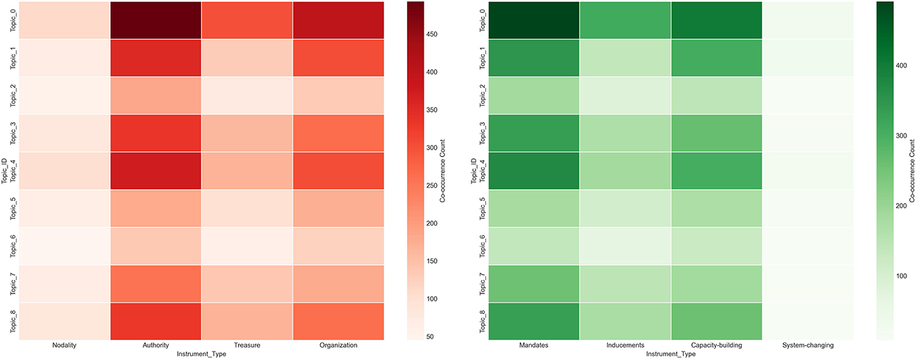 A strong intrinsic logical correlation also exists between different policy themes and the choice of instruments, as illustrated in Figure 7. Themes centered on macro-planning and standard-setting, such as “Development Planning” (T0), “Evaluation Standards and Labeling Systems” (T4), and “Development and Issuance of Local Green Building Standards” (T8), exhibit the highest co-occurrence frequency with Authority/Mandates instruments, reflecting the government's reliance on regulatory measures when establishing the institutional foundation. In contrast, “Incentives for Innovation and Demonstration Projects” (T7) correlates highly with Treasure/Inducements instruments; within policies related to this theme, these two instrument types were used in 49.5% and 52.0% of cases, respectively, clearly reflecting the theme's underlying policy intent. Furthermore, themes such as “Promotion and Exchange of Green Building Technologies” (T5) and “Expert Committee and Mechanism Building for Green Building Evaluation” (T6) are more closely associated with nodality/capacity-building and organization instruments. These specific patterns of theme-instrument pairing reveal the differentiated governance strategies the government employs when addressing different policy problems.