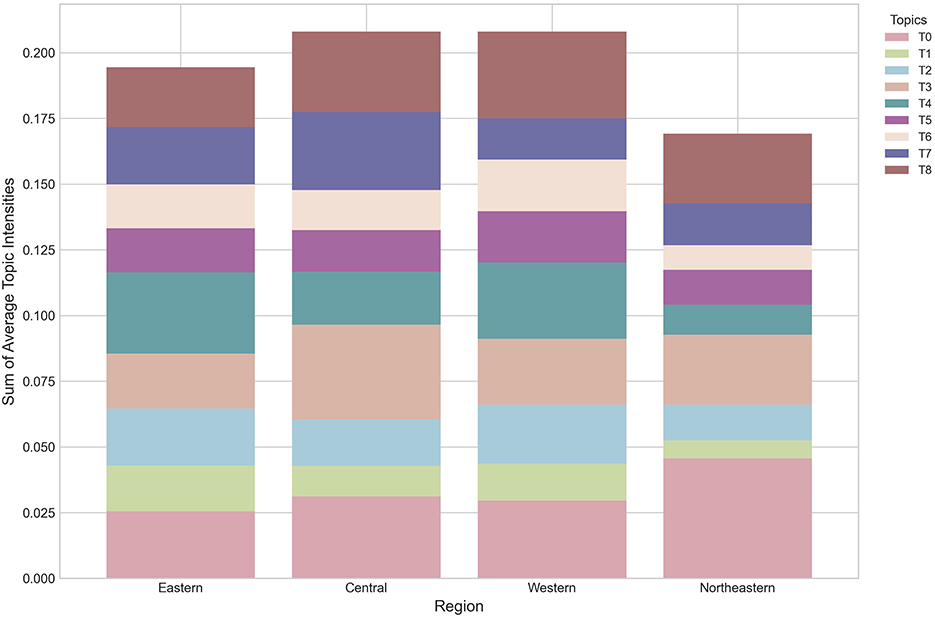 The regional comparative analysis aims to examine the influence of regional heterogeneity. Following the geo-economic division standards of the National Bureau of Statistics, this study categorizes the local policy samples into four regions: eastern, central, western, and northeastern. We will separately calculate and compare the similarities and differences in each region's thematic focus and policy instrument mix. This approach is intended to reveal the strategic differences in green building governance among regions at varying levels of development and to provide evidence for the spatial differentiation of policy.