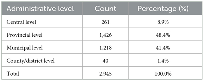 Final corpus composition: After applying the aforementioned retrieval and screening procedures, a final “China Green Building Policy Corpus” comprising 2,945 policy texts was constructed. The distribution of these documents across the four administrative levels (central, provincial, municipal, and county) is detailed in Table 1. This dataset, spanning four administrative levels, establishes a solid data foundation for the subsequent multi-dimensional, multi-level comparative analysis.