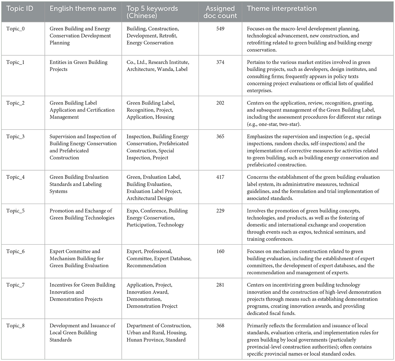 As shown in Table 2, the topic coherence score peaked at 0.6389 when K = 9. Although it fluctuated thereafter, it did not surpass this peak. For further verification, we conducted a detailed manual interpretation and comparison of the topic sets generated at several high-scoring points, including K = 7, K = 9, and K = 17. The results indicated that when K = 7, some topics were overly broad, merging policy issues that should have been distinct. Conversely, when the K value was too high (e.g., K = 17), it led to issues of topic redundancy and excessive granularity, with some topics having ambiguous meanings and reduced interpretability. By integrating quantitative metrics with qualitative judgment, we found that the set of topics generated at K = 9 was the most semantically clear, distinct, and comprehensive, and could most effectively summarize the core agenda of China's green building policy. Therefore, this study ultimately determined to extract nine core policy themes.