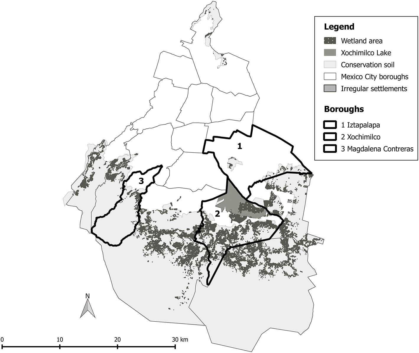 Map of Mexico City, the three boroughs in which qualitative data was elicited, and the conservation zone. Map prepared by B. Hernández. Sources: data of irregular settlements provided by B. Tellman, sourced from Secretaria de Medio Ambiente de la Ciudad de México (2016); data on Conservation Soil & Xochimilco area provided by PAOT (2016), sourced from Atlas Geográfico del Suelo de Conservacicón del Distrito Federal (2012). PAOT, Mexico City.