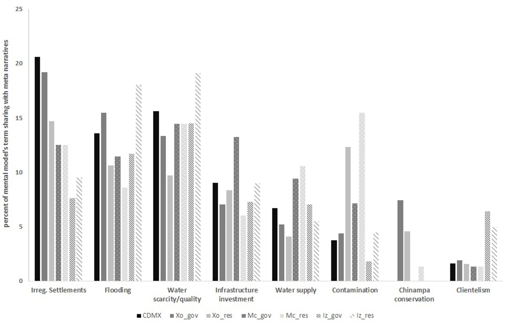 Percent of respondents' mental models that share terms with meta-narratives. CDMX, Mexico City Authorities; Xo_gov, Xochimilco Borough Government; Xo_res, Xochimilco Residents (workshops); Mc_gov, Magdalena Contreras Borough Government; Mc_res, Magdalena Contreras residents (workshops); Iz_gov, Iztapalapa Borough Government; Iz_res, Iztapalapa residents (workshop).