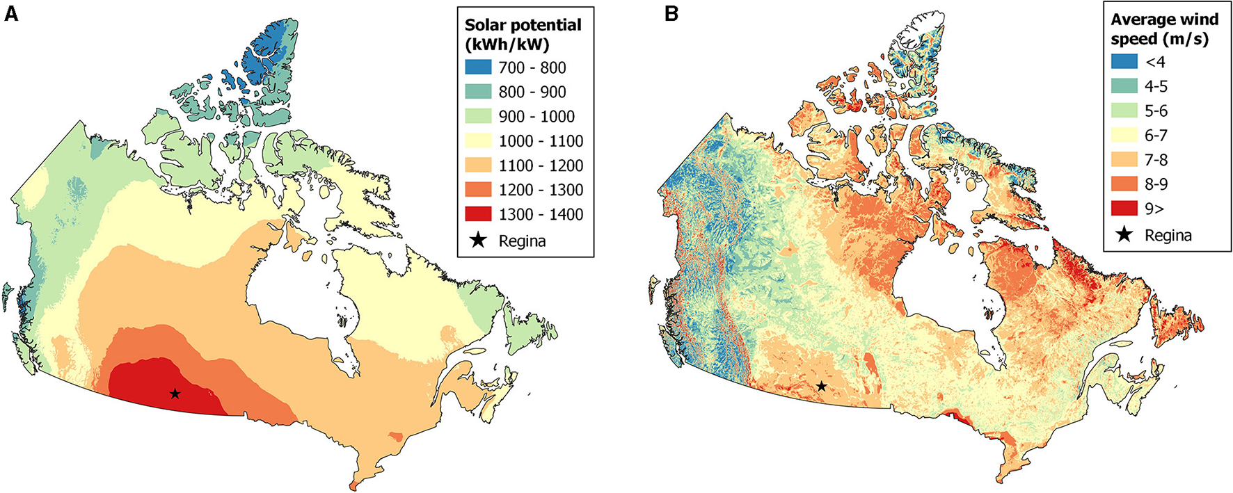 (A) Solar potential map (Government of Canada et al., 2020) (left) and (B) wind potential map (Global Wind Atlas, 2019) (right).