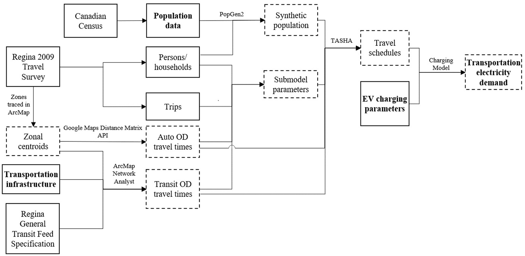 Transportation model processes, with solid boxes representing raw data inputs and dashes boxes representing a processed output. Note that bold text represents a direct tie-in to Figure 2.
