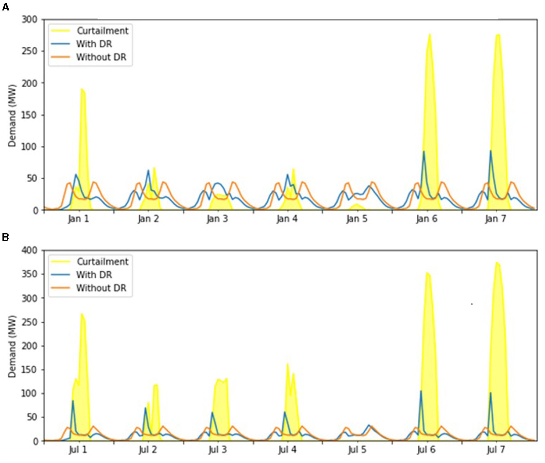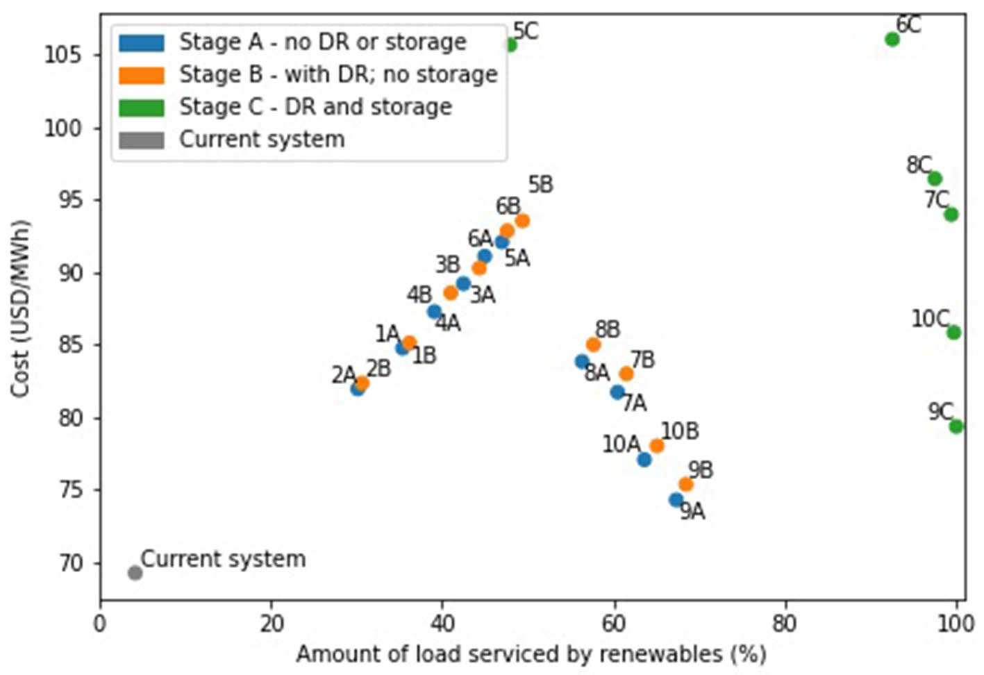 Storage was introduced to six scenarios (Scenarios 5 through 10) that were identified as having the potential to meet the renewable target if curtailment was decreased further than found in the previous stage. This was based on the amount of curtailment and progress toward the target renewable usage after the DR strategy was implemented (further discussion can be found in discussion). The storage technology was assumed to be lithium-ion batteries with a 4-h discharge duration. The maximum capacity of the storage technology (equivalent to the storage size multiplied by the duration of the battery) was assumed to equal the maximum curtailment within each scenario.