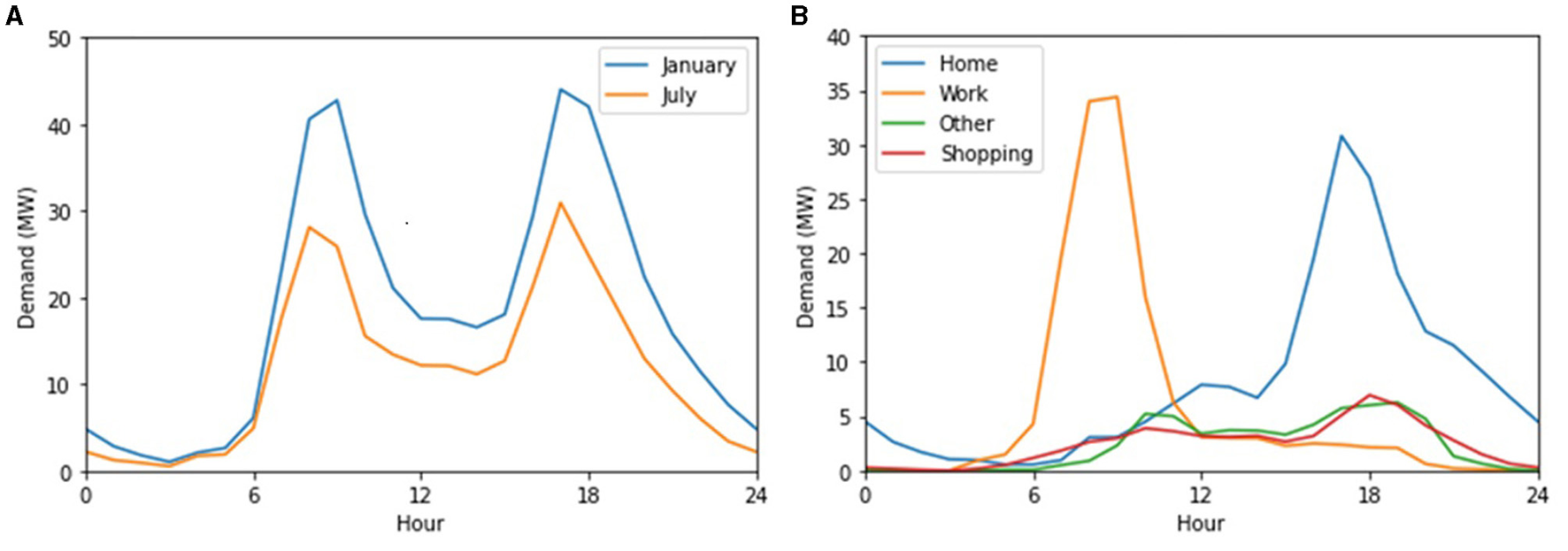 Figure 2 illustrates the novel linkage process; the solid arrows represent the linkage from the building and transportation sector models to the electricity system model, while the dashed arrows represent the linkage from the electricity system model to the demand side models. Once a scenario is selected, the building and transportation models—outlined in detail in the following sections—are run concurrently and output demand load curves. These are combined with a baseline demand to represent the total electrical load for Regina, which is then input directly into the electricity model. Although these models interact with each other while running a scenario, they are decoupled and individual insights are able to be drawn from each model individually, as well as from the linked outputs.