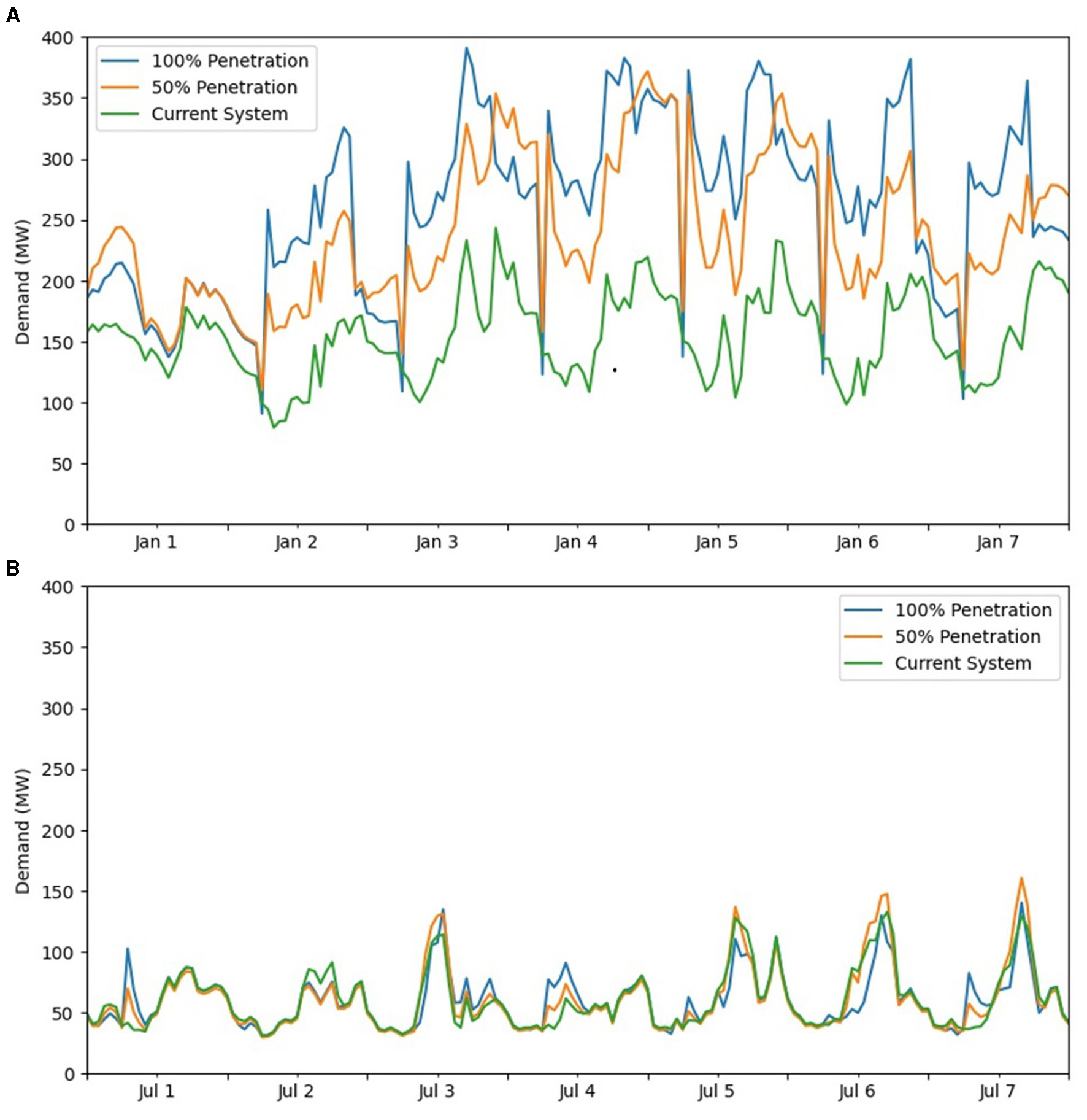 Electrification increases the annual peak demand by almost 50%, though the effects on overall electricity consumption varies by electrification level. An electrification level of 50%, along with building retrofits to make consumption more efficient, was found to decrease consumption by almost 18%, while an electrification level of 100% was found to increase consumption by 15% (Table 2). Buildings were shown to be the more significant source of the changes in consumption, with transportation contributing under 5% of the total for both 50 and 100% EV penetrations.