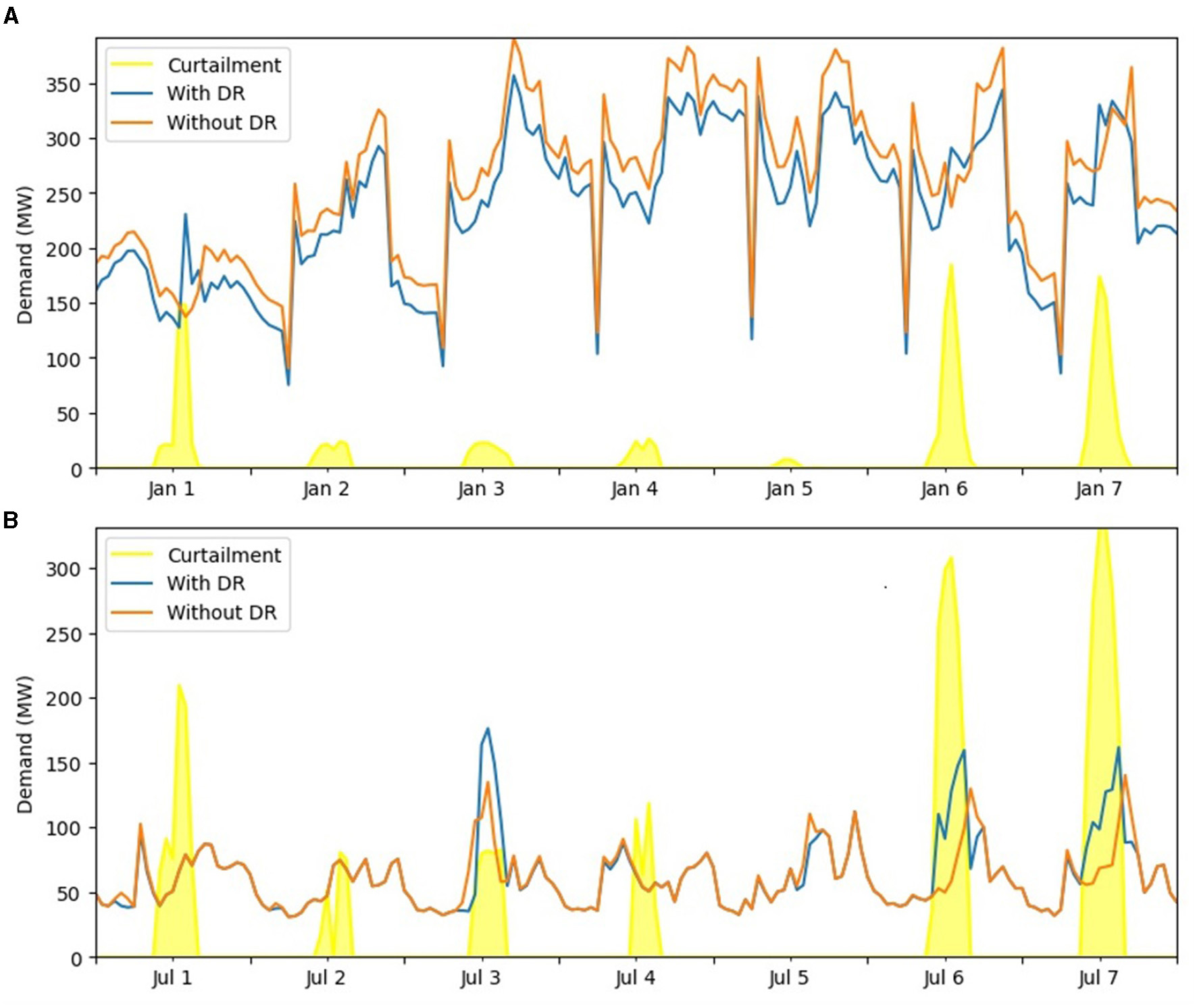DR was implemented in the model by manipulating the building setpoints for each hour based on whether VRE curtailment was occurring in that period. When the model is run without DR, all buildings are kept at a constant setpoint of 19°C for heating and 27°C for cooling, as per (SOURCE). In contrast, when DR is applied, building setpoints vary depending on if there is curtailment occurring, so that the buildings can be used as heat storage for the otherwise curtailed electricity. When curtailment is not occurring, setpoints relax to 18°C for heating and 28°C for cooling (i.e., lessening the electricity demand). During periods of curtailment, the heating and cooling setpoints change to the more restrictive values of 21°C and 26°C, respectively (i.e. increasing the electricity demand).