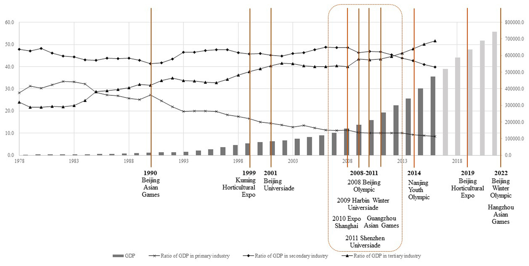 Mega-events, accumulation, GDP growth, and structure in China (1978–2022). Source: National Statistical Bureau.