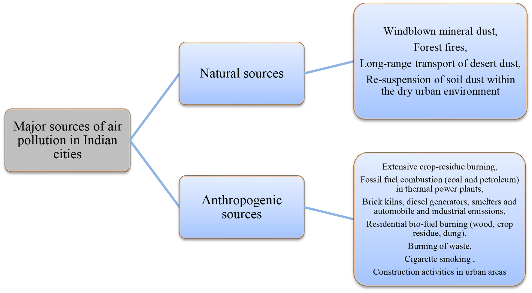 In Indian cities, the air pollutants are either emitted from natural sources such as long-range transport of desert dust influx originated from the western arid regions of Africa, Middle-East, and Thar (Rajasthan) regions, predominately during summer and pre-monsoon season (El-Askary et al., 2006) or they can be of anthropogenic origin as given in Figure 1 (Ghose et al., 2005; Habib et al., 2006; Prasad and Singh, 2007; Badarinath et al., 2010; Sharma et al., 2010; Kharol et al., 2011; Dandotiya et al., 2020).
