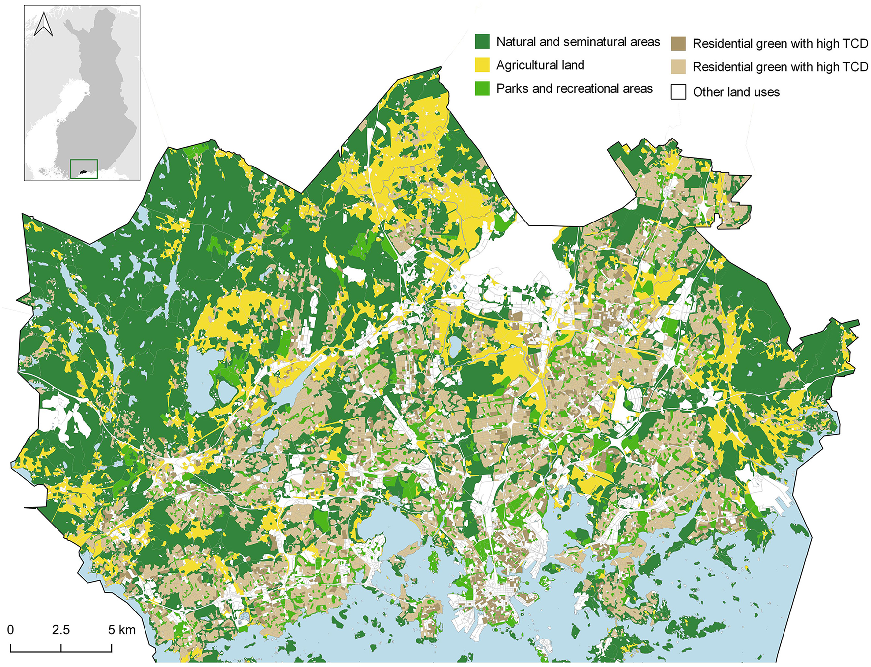 Map of the study area (Helsinki Metropolitan Area) and green infrastructure types used in the analysis.