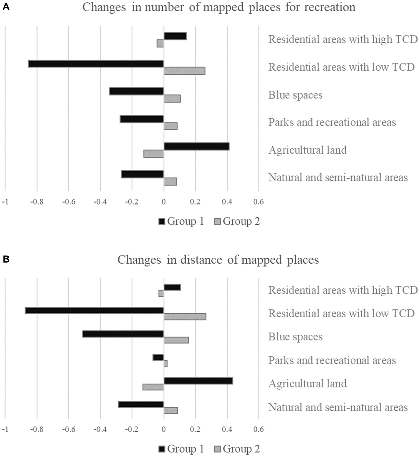 (A) Changes in number of mapped places for outdoor recreation and (B) Changes in mean distances (in meters) of mapped places to one's home per group. X-axis refers to standardized scores of changes, where values <0 show decrease and >0 increase in numbers/distances during the COVID-19 pandemic.