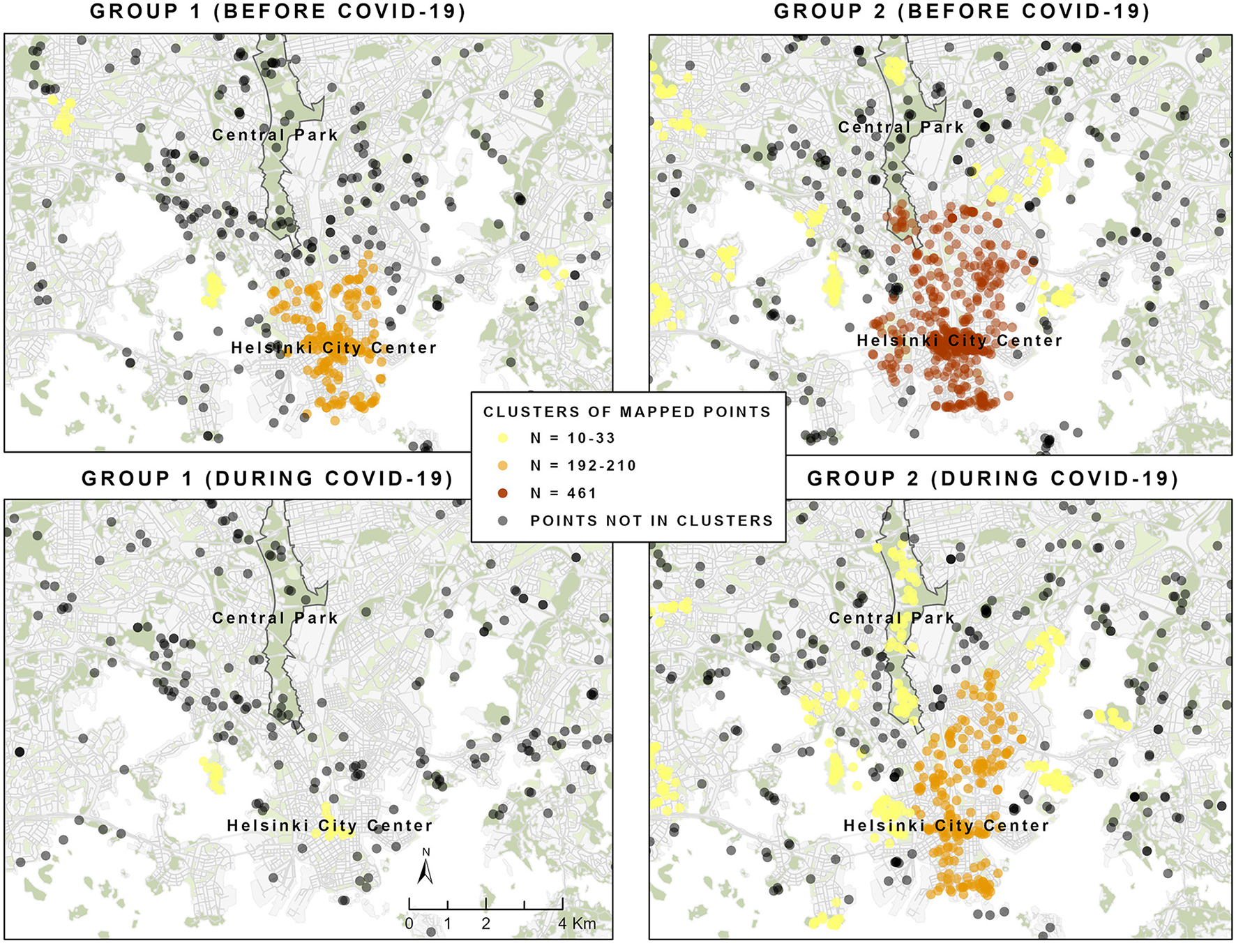 Figure 3 below visualizes the result of the density-based clustering analysis with a close-up view of the central part of Helsinki. Mapped recreational places of Group 1 mostly clustered in the city centre before the COVID-19 pandemic, yet mapping and spatial clustering of places in the city centre decreased during the pandemic. A similar trend can be observed for Group 2 however, the spatial patterns are different. For example, during the COVID-19 pandemic there was more clustering of mapped points in Parks and recreational areas like in Helsinki's Central park (Figure 3). Such increase in use of Parks and recreational areas for respondents in Group 2 was also indicated from the results of the K-means clustering analysis (see Figure 2).