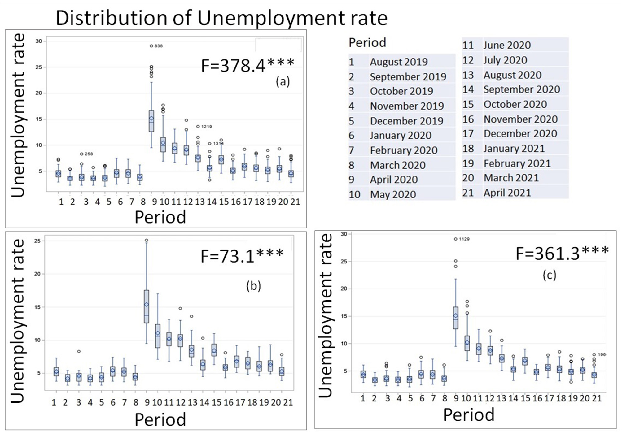 For Hypothesis 1, we tested if unemployment rates varied by month starting with August 2019 data through April 2021 (the latest month for which data is available at BLS). The 21-month-worth unemployment data for all TN counties combined approximates normal distribution. We conducted a one-way ANOVA for unemployment rates (a dependent variable) for all counties combined for all 21 months, regardless of their social disadvantage status, and broken down by disadvantage. The model is estimated on data from August 2019 through April 2021. The results are shown in Figure 4. The analysis performed employed the SAS statistical software package (SAS, 2010).