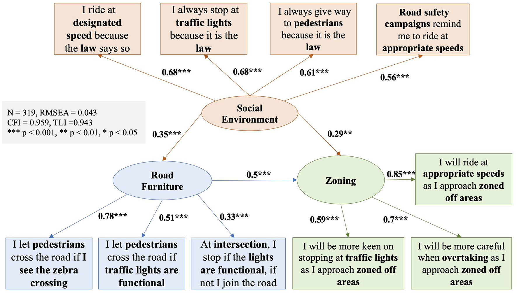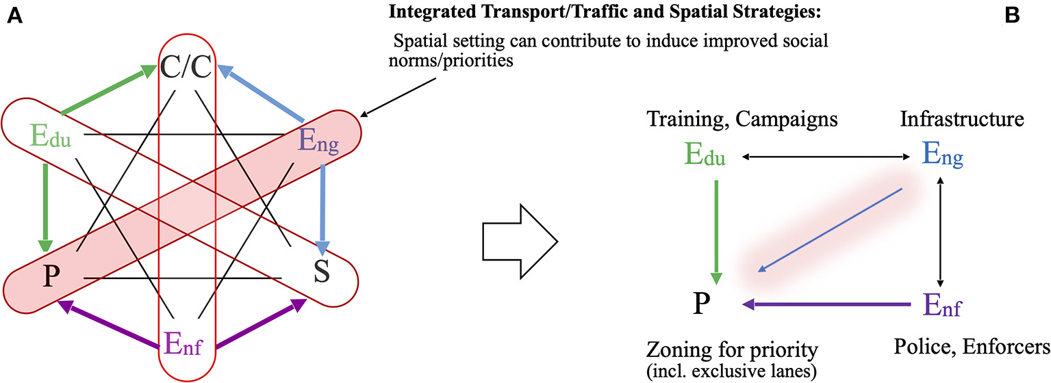 Therefore, different forms of education and training may increase the effectiveness of engineering and enforcement interventions that may in turn influence the riders' behavior toward adhering to zoning and exclusive lane regulations. The SEM analysis was adopted in order to identify dimensions of 3Es that would enable the riders to adhere to the spatial strategies of zoning and exclusive lanes in the city. By identifying the latent structure, a combination of solutions was proposed as a way to promote sustainable mobility.