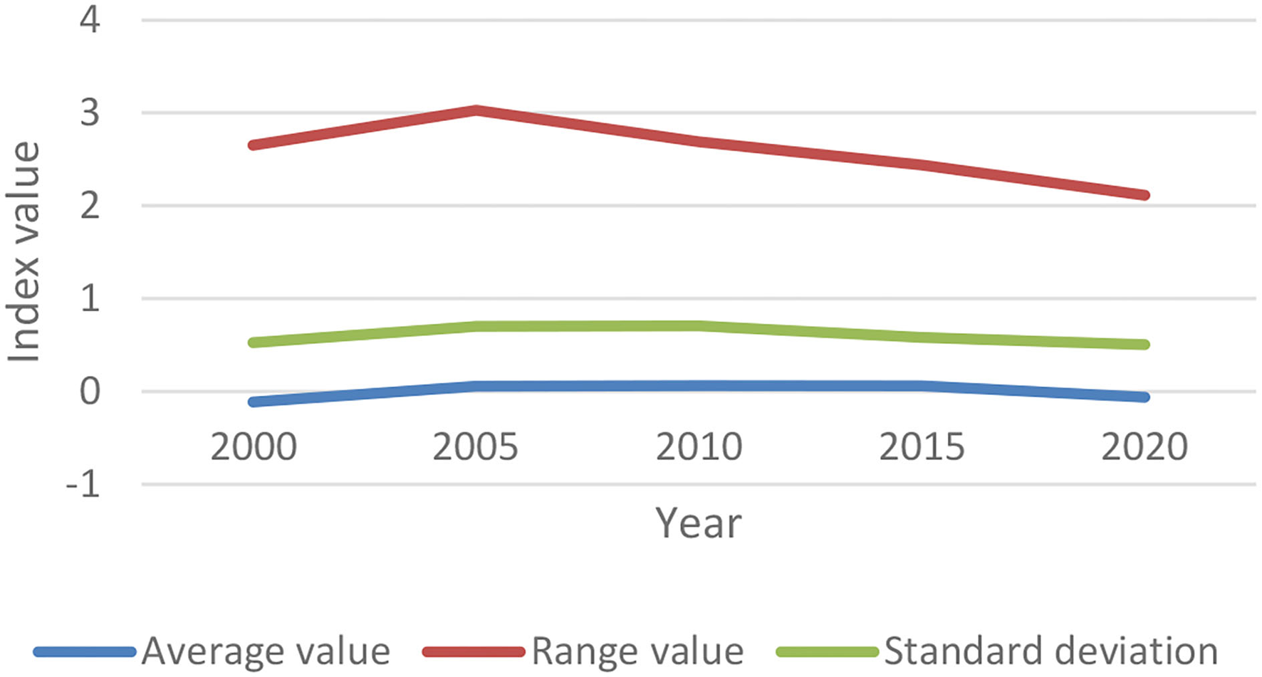 After a lateral analysis of the scores, this paper finds that there are great different differences in the 41 cities in the Yangtze River Delta in terms of the level of urban-rural integration development. There is a wide difference between the scores of the top one Shanghai and the last one Fuyang. It is also noticed that the average score of the urban-rural integration development level of 41 cities in the Yangtze River Delta in 2000, 2005, 2010, 2015, and 2020 is −0.114, 0.058, 0.060, 0.061, 0.021, and −0.065 respectively, which means that the development level of urban-rural integration in the Yangtze River Delta presents a slight fluctuating upward trend overall. The standard deviations of the development level of urban and rural integration in the 41 cities in the Yangtze River Delta show small fluctuations but retaining same basically. However, the range first rises and then declines, and shows an obvious declining trend, which indicates the gap between 41 cities in the Yangtze River Delta shrinks in terms of urban and rural integration development shrinks gradually and the regional imbalance has been improved (as shown in Figure 2). It's found by comparing chronologically: During the urban-rural integration development from 2000 to 2020, the urban-rural integration development of most cities has been improved, especially Huzhou with an increase of 1.3 points, and has risen 15 in the ranking of urban-rural integration of urban agglomerations in the Yangtze River Delta. It reflects that the urban-rural integration development of Huzhou city has received great attention and support in the past 20 years. However, some cities, the level of urban-rural integration development declines greatly in cities such as Huainan, Tongling, Bengbu, Shanghai, Jinhua, Huai'an, Fuyang, Shaoxing and Zhenjiang, reflecting the widening gap between urban and rural areas in these cities during this period, with cities becoming stronger and villages weaker and in slow development.